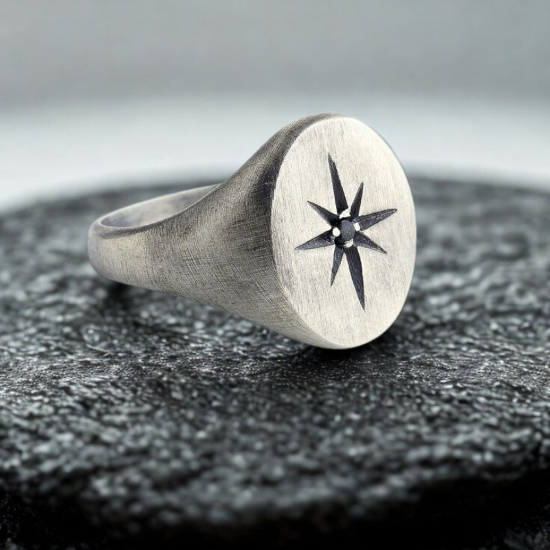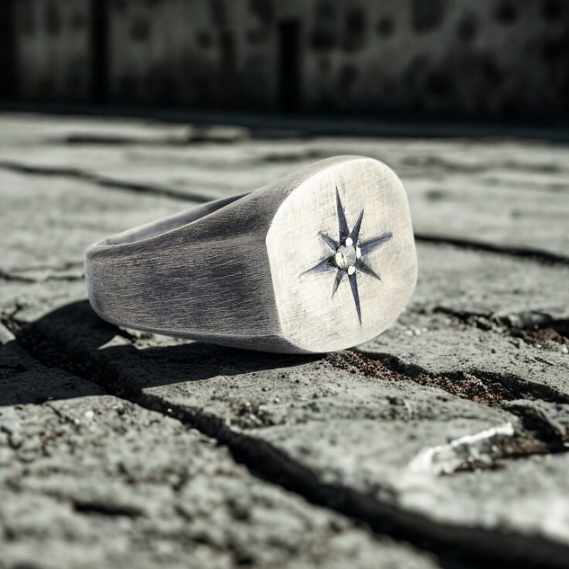 The handmade Compass Ring, made of solid sterling silver 925, has a rough,