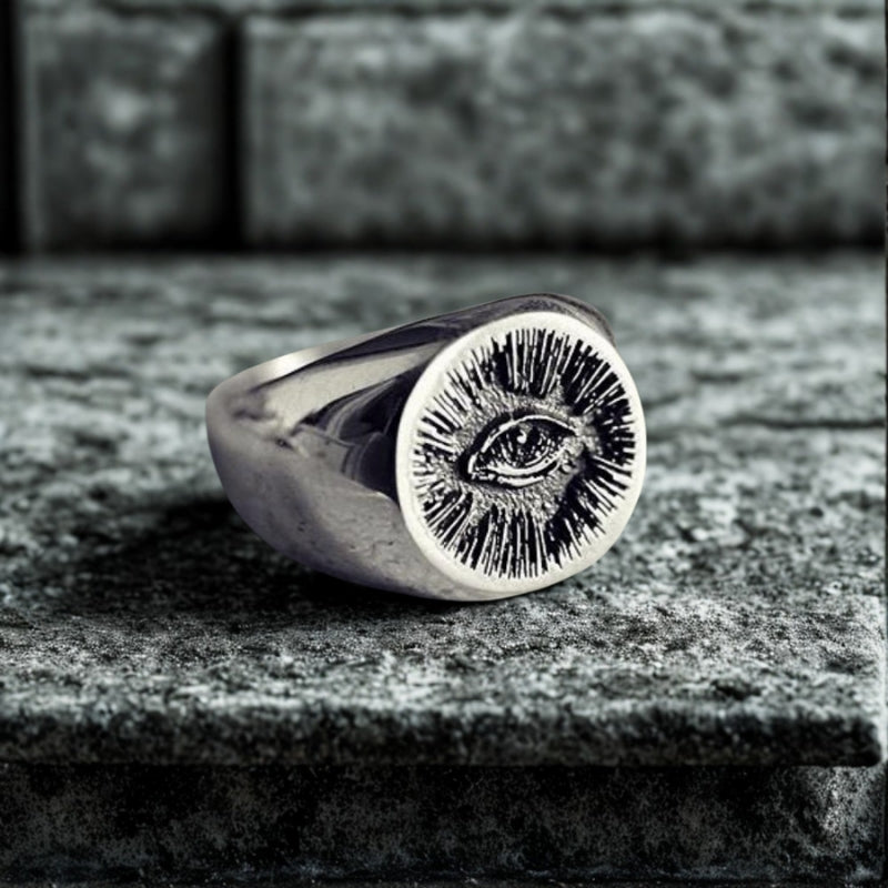 Bold and protective, the handmade Evil Eyes Off Signet Ring is crafted from solid