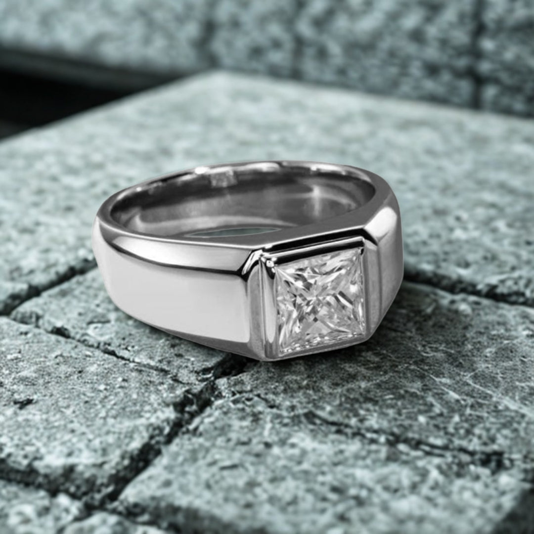 A sleek princess-cut moissanite ring that combines modern geometry with