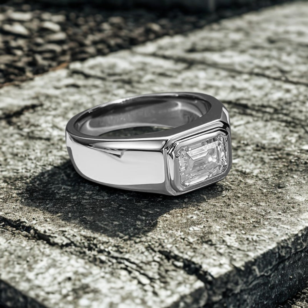 An emerald-cut moissanite ring radiating refined elegance and brilliance.