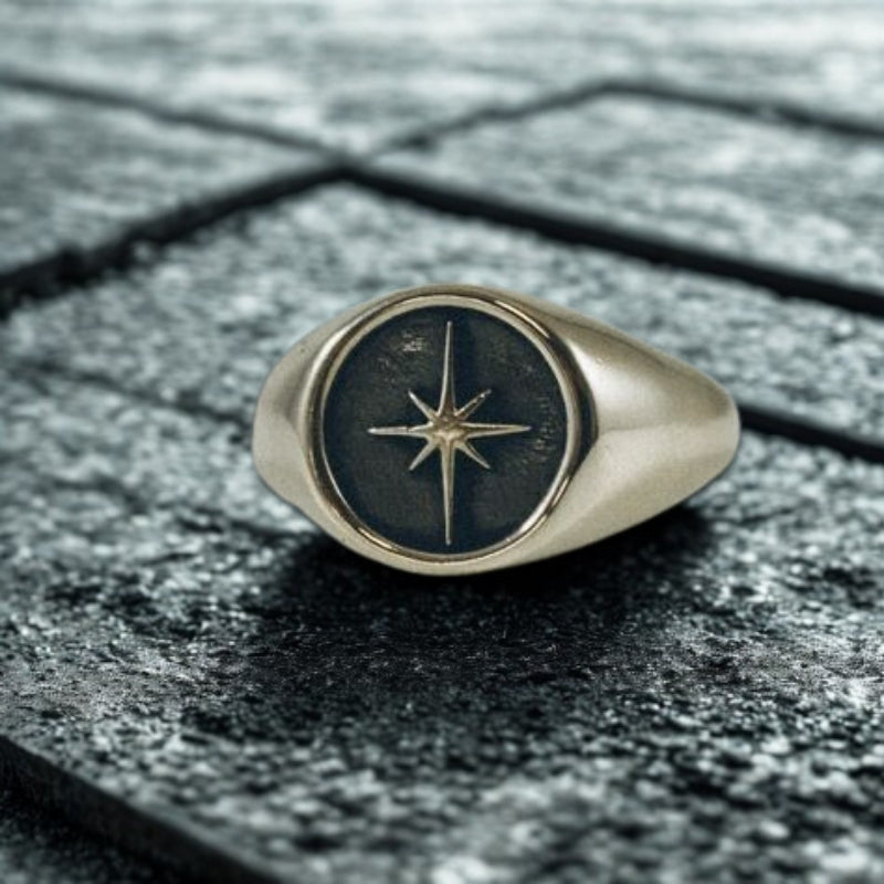 The handcrafted North Star Signet Ring is made of sterling silver 925 and has an