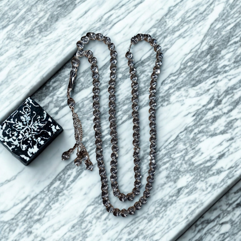 The Silver Aura Tasbeeh-e-Noor is a refined expression of craftsmanship and tradition. Each bead is precision-formed from premium Sterling Silver 925, polished to a soft lustre that feels warm and comfortable in the hand. With a classic 33-100 bead count, this tasbeeh offers a smooth, balanced rhythm for prayer, meditation, or mindful moments — designed to be used daily and treasured for years.